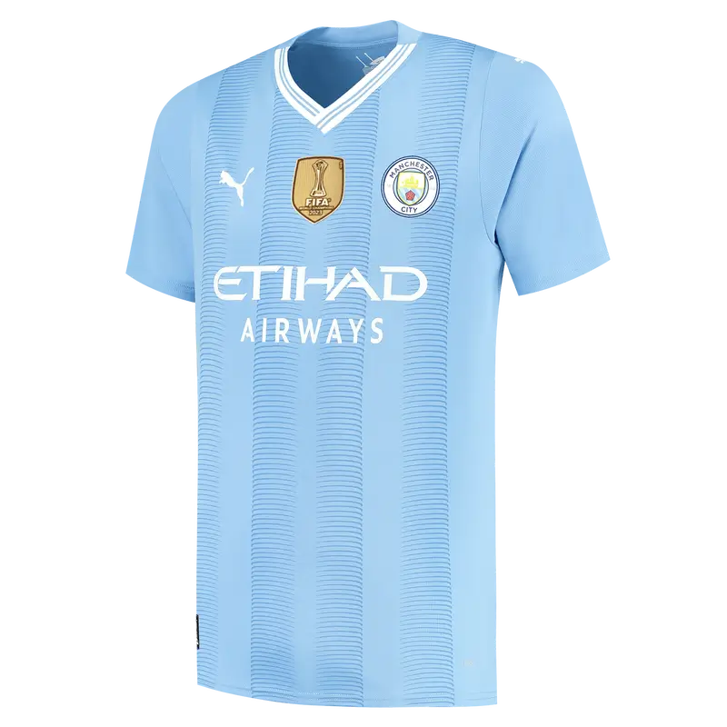 Vista-se com a Camisa Manchester City Campeão Mundial Azul 2023/24 com valor promocional. Logo mais a Camisa Camisa Manchester City Campeão Mundial Azul 2023/24, por outro lado o destaque está a gola V com recorte /reto frontal e logo mais as três listras em tamanho grande, aplicadas nas laterais do manto de maneira colorida. Confira os detalhes da Camisa Manchester City Campeão Mundial Azul 2023/24.