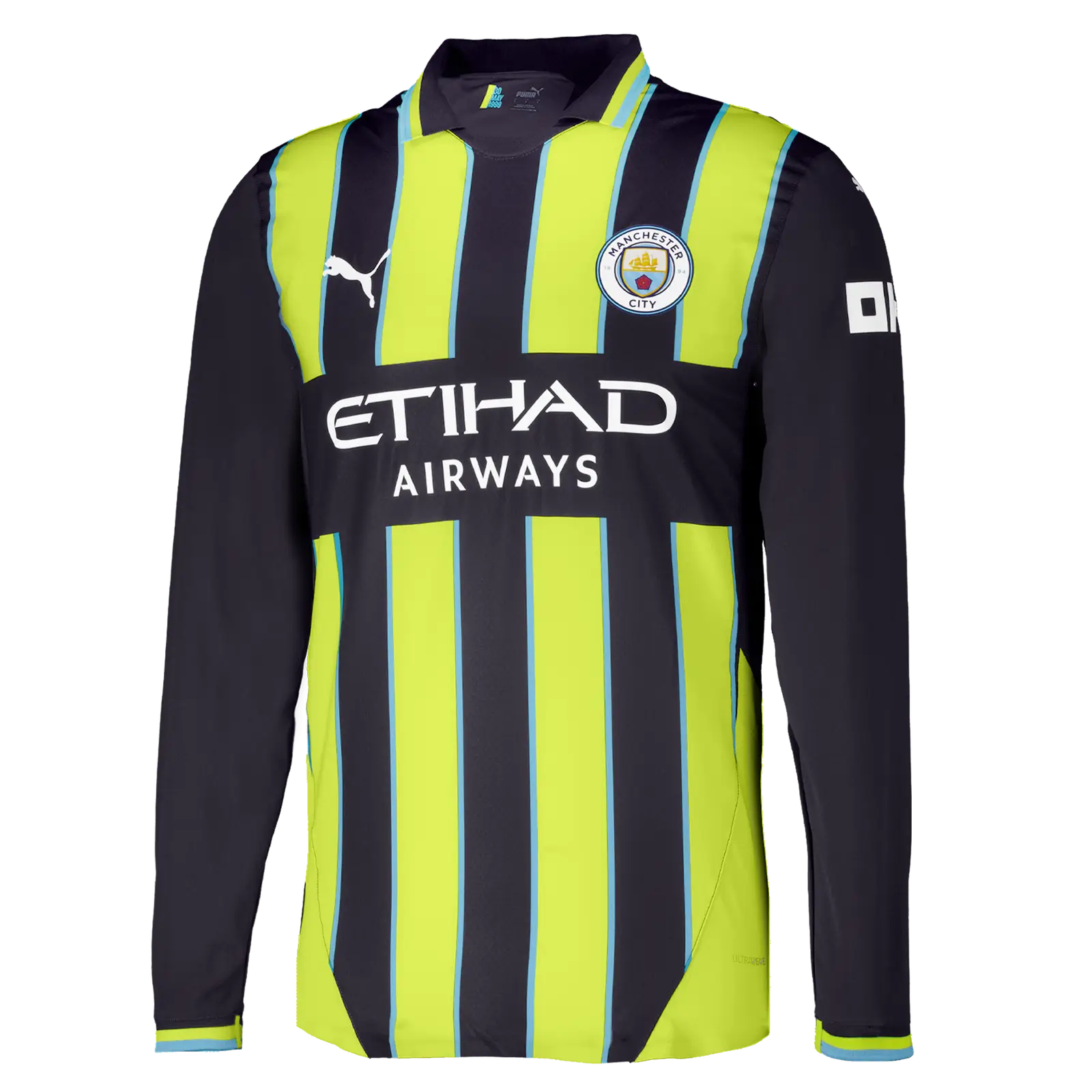 Vista-se com a Camisa Reserva Manchester City Verde/Preta 2024/25 Manga Longa com valor promocional. Logo mais o destaque está a gola V com recorte reto frontal e logo mais as três listras em tamanho grande, aplicadas nas laterais do manto de maneira colorida. Confira os detalhes do Camisa Reserva Manchester City Verde/Preta 2024/25 Manga Longa.