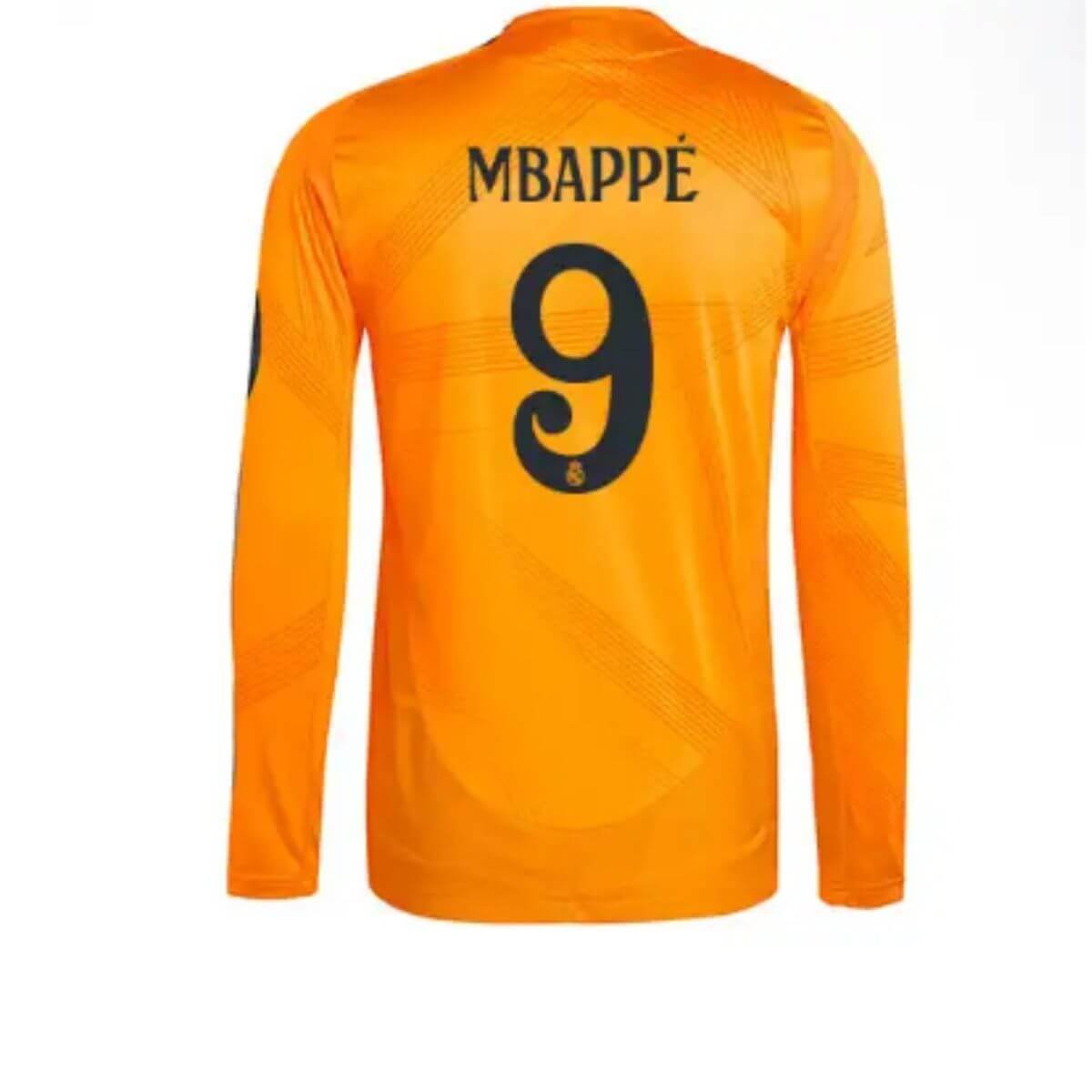 - Nome do Produto: Camisa Reserva Real Madrid Mbappe #9 Manga Comprida 2024/25 Laranja Jogador