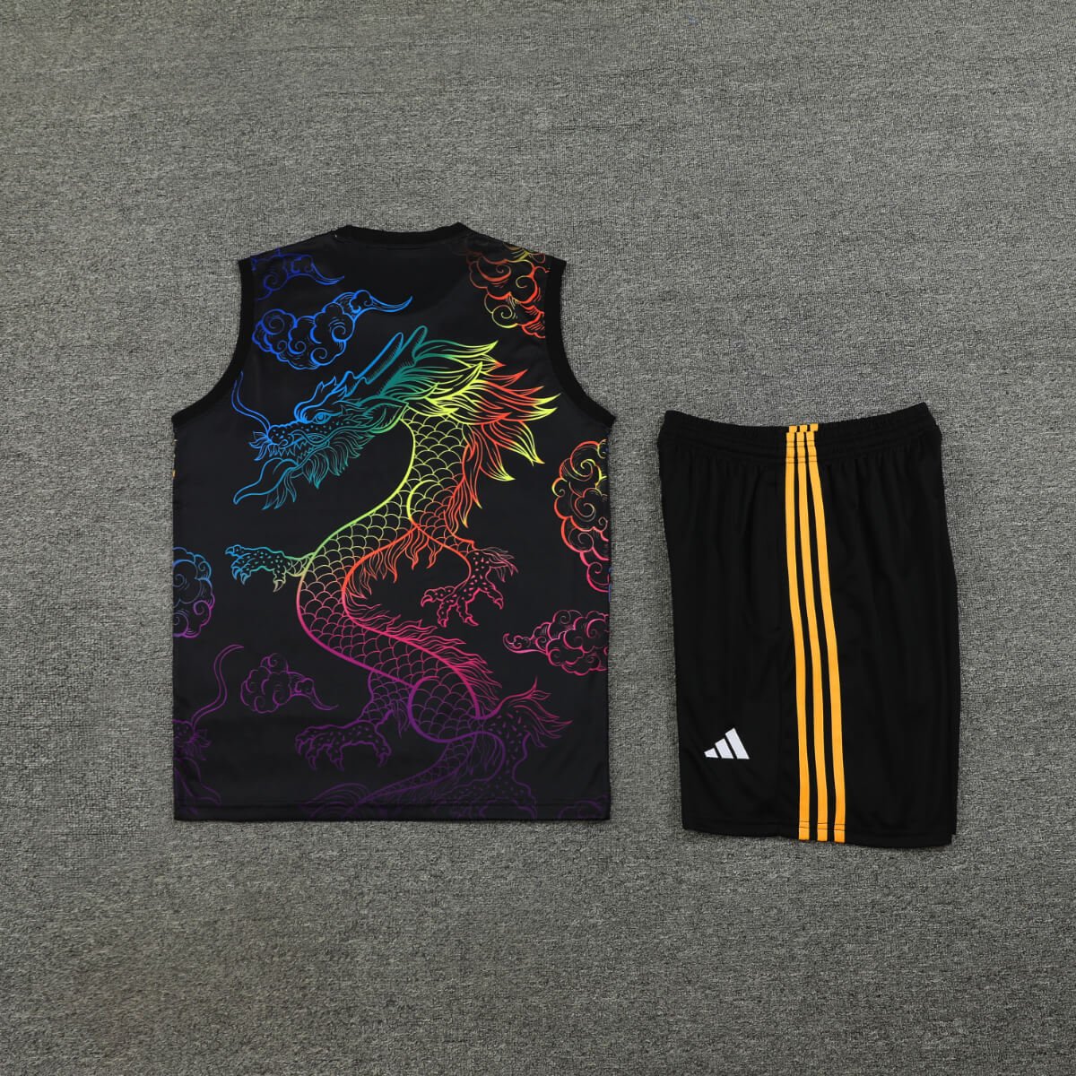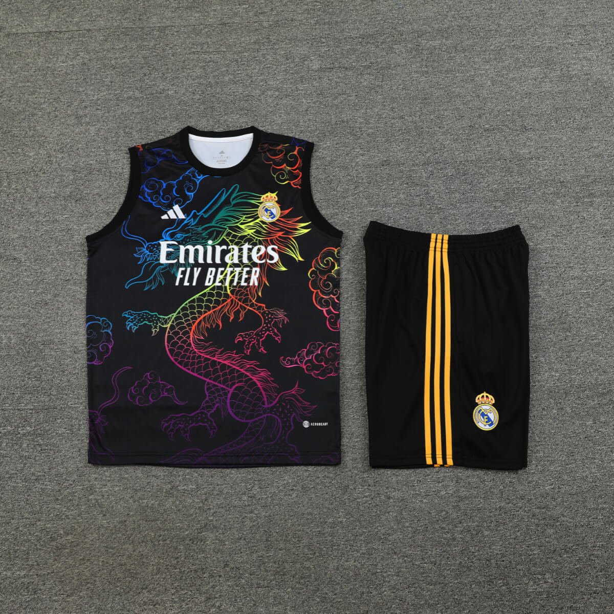 - Nome do Produto: Kit Regata e Short Real Madrid Treino Preto Dragão 2024/25